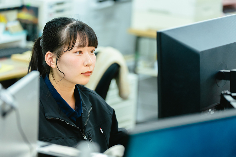 現在は、図面や出荷依頼の出力、必要なデータの準備、作業が終わった工程の完了処理を行っています。一見地味に見える仕事かもしれませんが、一つひとつの作業を丁寧に進めることが大切で、確認を怠ると後の工程に影響してしまうこともあるので、常に丁寧さを意識しています。